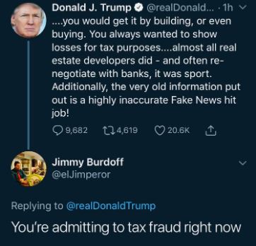 ![]() Via liberation.fr Trump explique qu'une entreprise cherche toujours à présenter des pertes financières pour échapper à l'imposition. Serait-ce un aveu sur le fait qu'il aurait fait de l'évasion fiscale ? (En fait pas plus que ca, en ce sens il a simplement raison je dirais) ![]() Source Citation : Alors que le Trésor refuse de transmettre au Congrès les déclarations d'impôts du président, le New York Times a affirmé, mercredi, que l'endettement de Donald Trump lui a permis d'éviter de payer tout impôt sur le revenu pendant huit ans. (france24.com)