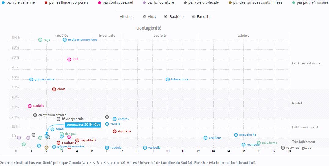 Citation : Selon l’Organisation mondiale de la santé (OMS), le taux de mortalité du 2019-nCov est de 3 %, soit bien en dessous de celui du syndrome respiratoire aigu sévère (SRAS) – avec un taux de mortalité de 9,6 %, il avait fait 774 victimes en 2003 (Via lemonde.fr/les-decodeurs qui se basent beaucoup sur ce graphique de informationisbeautiful.net)
