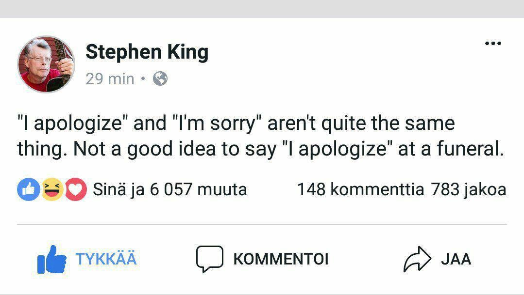 ![]() Traduction : "Je m'excuse" et "Je suis désolé" n'ont pas tout à fait le même sens. Ce n'est pas une très bonne idée de dire "Je m'excuse" à un enterrement. Stephen King