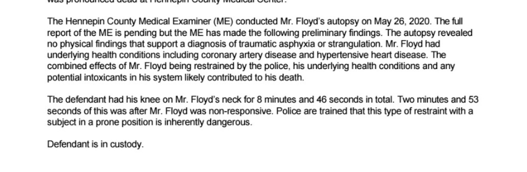 Derek Chauvin a été arrêté pour meurtre au 3è degrés (homicide involontaire). https://www.youtube.com/watch?v=3FixWRJIdH0 Mais bien sûr c'est ensuite de ça que la justice va faire son travail.
