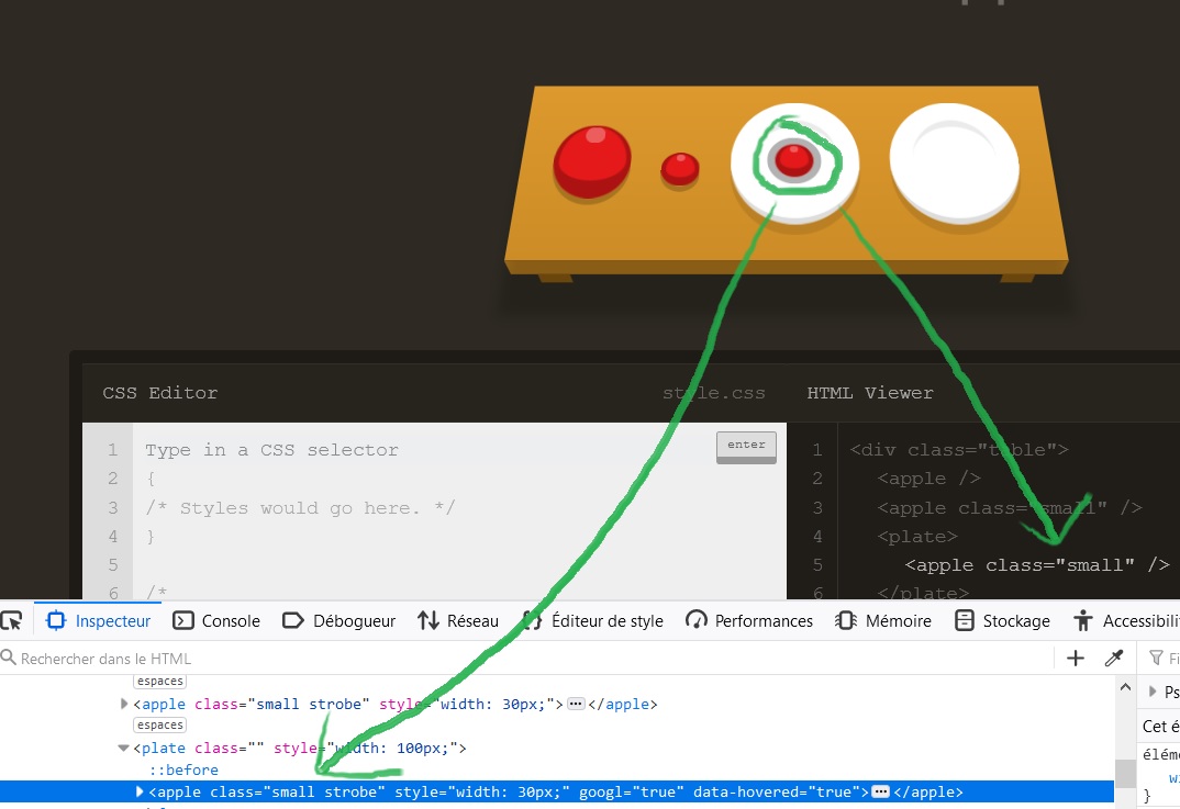 ![]() >>> Jouer <<< Petit jeu d'apprentissage des sélecteurs CSS. Je trouvais cet outil pédagogique marrant et bien fichu alors je vous le partage ![]() En gros, vous avez une table avec dessus des fruits et des assiettes. Vous devez utiliser un sélecteur CSS pour sélectionner uniquement ce qui est demandé, en vous aidant du code HTML mis à droite. Vous avez juste à mettre votre réponse à la place de "Type in a CSS selector" et appuyer sur ENTREE. Si c'est bon, vous passez au niveau suivant. Bon jeu!