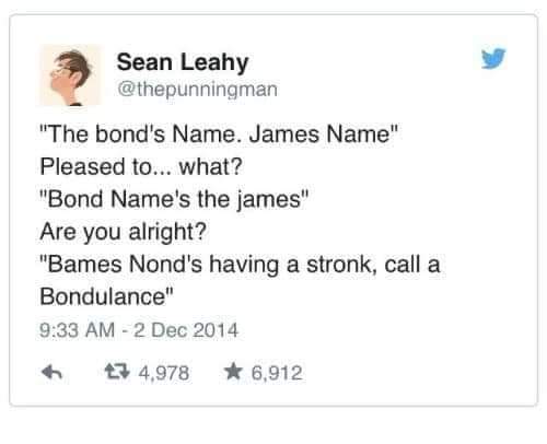 ![]() "Je bond Suis. James Suis." Ravi de... quoi ? "Bond suis je james" Tout va bien ? "Bames Sond fait un ABC, appelez une Bondulance"
