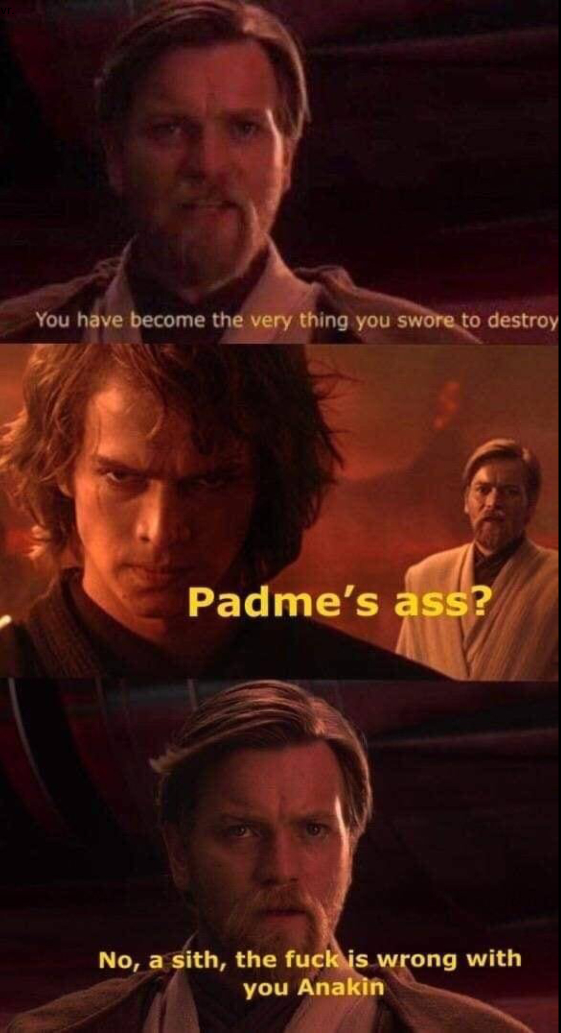 ![]() - Tu es devenu exactement ce que tu t’étais juré de détruire. - Le cul de Padmé ? - Mais non, un Sith ! T’es con ou quoi Anakin ?