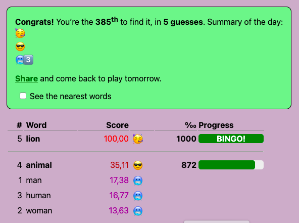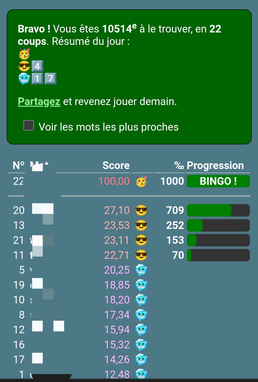 Enfin, je dis ça mais je l'ai eu en 166.... Update: Semantle en 62, effectivement moi aussi j'ai l'impression de moins galérer sur la version anglaise