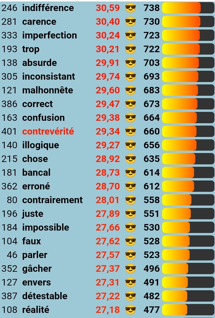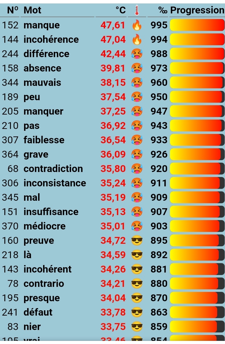 ![]() Mot d'aujourd'hui en 314 essais, quelle prise de tête ! J'ai tourné autour pendant tellement de temps, à la fin j'ai dû aller sur une page Wikipédia et taper tout ce sur quoi je tombais, tellement ça me tapait sur le système. Mais bien sûr j'y retournerai demain... J'ai trouvé #cemantix nº108 en 314 coups! ![]() ![]() ![]() ![]() ![]() ![]() ![]() ![]() ![]() ![]() ![]() ![]() ![]() ![]() ![]() ![]() ![]() ![]() ![]() ![]() ![]() ![]() ![]() ![]() ![]() ![]() ![]() ![]() ![]() ![]() ![]() ![]() ![]() ![]() ![]() 🧊🧊🧊🧊 ![]() ![]() https://cemantix.herokuapp.com/