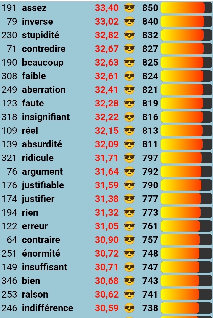 Hier et avant-hier j'ai trouvé en coup de bol en 25 essais, mais cette nuit j'ai passé deux heures et 400 essais à chercher le mot du jour, je bloque désespérément à 995/1000... J'ai l'impression d'avoir tout tenté et ça me prend la tête. Voilà ma progression, que je mets en spoil si certains veulent le faire eux-mêmes : ![]() ![]() ![]()