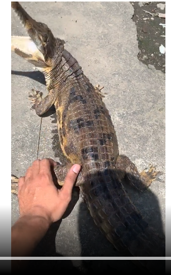 Un homme caresse le dos d'un gavial du Gange. Mauvaise idée.