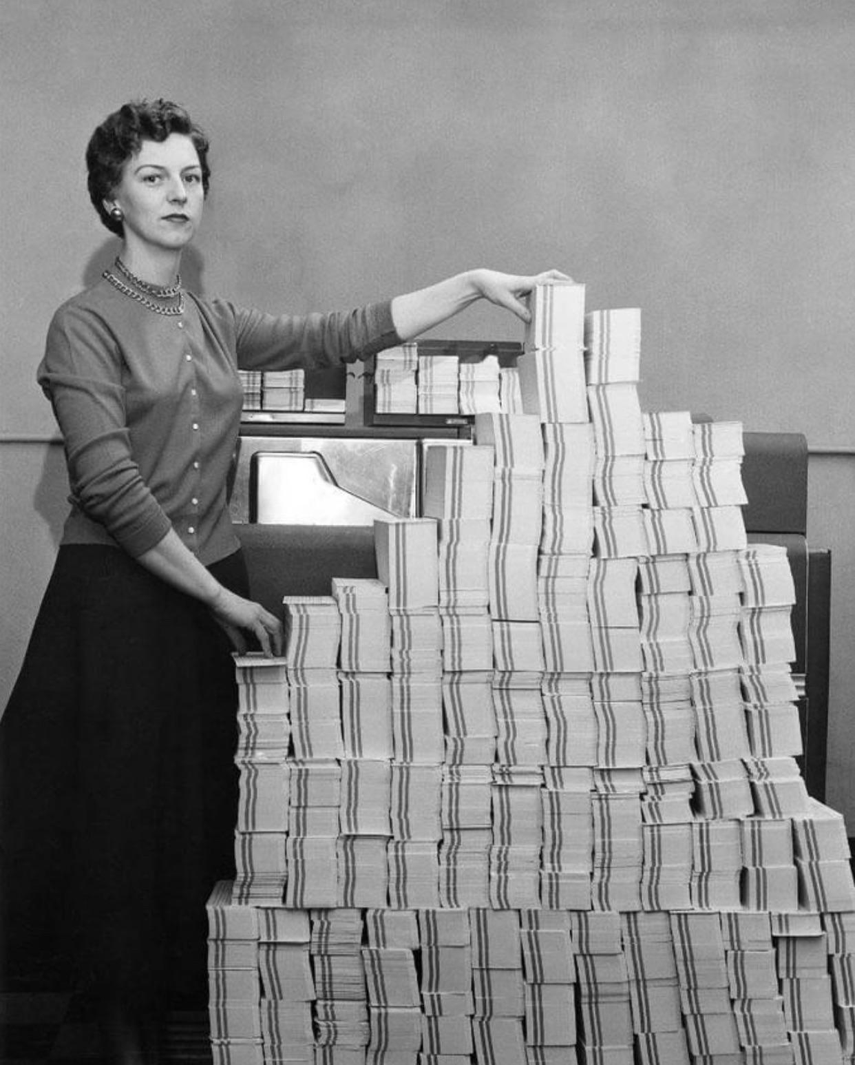 ![]() 5 mégaoctets de données informatiques en 1966 : 62 500 cartes perforées, prenant quatre jours à charger. ![]()