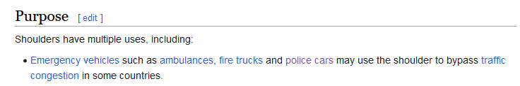 Peut être que dans votre pays c'est une bande "d'arrêt" d'urgence, mais ce n'est pas nécéssairement le cas à l'international (ca tombe bien, c'est de ca dont on parle). Ce n'est pas le cas chez moi d'ailleurs. On appelle ca "Vägren", la "voie gouttière". https://en.wikipedia.org/wiki/Shoulder_(road) ![]() Citation : Les voies d'urgence ont plusieurs utilisation, dont: