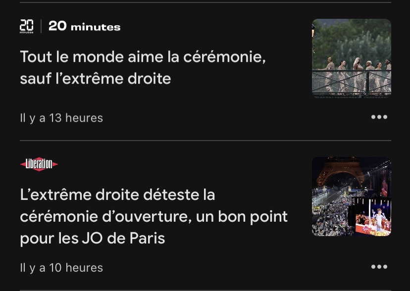 | Je masterise !    Inscrit: 17/10/2021 10:47 Post(s): 3784 Karma: 2767 | Tout ce que j’ai retenu de la cérémonie des JO de Paris c’est que si t’aimes pas ça, t’es un facho… Y’a pas débat.