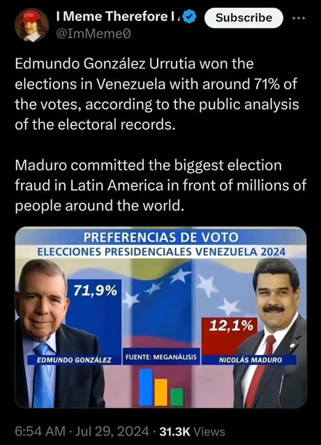 À vitesse réelle, ce n'était pas si impressionnant: https://www.eurosport.nl/surfen/paris-2024/2024/paris-2024-historische-score-surfer-gabriel-medina-levert-iconische-foto-op_vid2196021/video.shtml Un nord-coréen prend une photo avec des sud-coréen, la Corée du Sud passe cette image en boucle, symbole d'un petit rapprochement des 2 Corée. ![]() Pendant ce temps au Venezuela, le président Maduro a gagné les élections avec soit-disant 54% des voix, alors que les citoyens des bureaux de votes ont fait leurs propres comptes et seraient arrivés à 12%: ![]() ![]() Ceci était même le décompte officiel des votes par zones avant une "panne" (paraît-il, je n'ai pas vu ceci sur des sites d'informations donc à prendre au conditionnel).