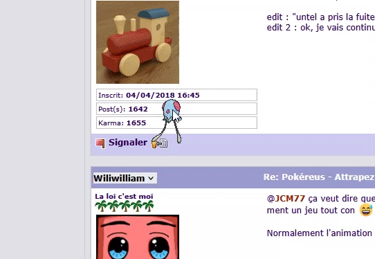 ![]() Pokéreus, le jeu Pokémon sur le forum de Koreus.com Bonjour à tous ![]() J'ai réalisé un petit jeu qui fait apparaître des Pokémon dans les pages du forum! Si si ! C'est un jeu complètement solo, qui accompagne vos visites sur le forum : il se déroule lentement, sur la durée, et se joue de manière quasi passive. Le contenu:• Pokédex : la liste des Pokémons (vu/attrapé/rareté) • Apparitions animées + capture de Pokémon en cliquant dessus (Les pokémons apparaissent aléatoirement lors de votre navigation sur le site) • Encens : double les chances d’apparition pendant une durée limitée (pages visitées) • les Poké balls : Poké Balls / Super Balls / Hyper Balls (x1 / x1.5 / x2 de chance de capture) • Pokédollars ₽ avec récompense qui décroit avec le nombre de capture d'un même Pokémon • Magasin (achats en ₽, sélection de la balle active, activation de l'encens) • Options : activer/désactiver les apparitions, historique des 50 derniers événements, export/import protégé, reset global du jeu, partager son profil Joeur sur le forum • Notifications de jeu (que l'on peut skip) • Menu Pokéreus rajouté dans la barre de menu de gauche de Koreus. Le jeu est actif uniquement sur les pages du forum. Installation rapide Installez l’extension Tampermonkey . Pas le choix, c'est le seul moyen d'injecter le jeu sur Koreus. Cliquez ici : Installer le script Pokéreus (testé sur Chrome/Edge/Firefox) Acceptez l’installation. Rechargez une page du forum : c’est tout .Le script se met à jour automatiquement via Tampermonkey. Mais vous pouvez la forcer via tampermonkey ou simplement en cliquant à nouveau sur le lien d'installation ci-dessus Export / import des données Dans Options → Transfert des données, vous pouvez exporter votre progression pour l'importer sur un autre navigateur (ou simplement faire une sauvegarde de données, on sait jamais). Problèmes connus / Aide• Si rien ne se passe : vérifiez que Tampermonkey est activé et que le script est autorisé sur koreus.com. • Sur Firefox/Chrome, pensez à désactiver tout bloqueur qui empêcherait les images de se charger (objets/pokémons). • Pour repartir de zéro : Options → Réinitialiser toutes les données. • Le jeu n'a pas vocation d'être mis à jour. Mais si c'est le cas, je vous le signifierai dans ce topic. Si vous avez activé l'option 'Mises à jour automatiques' vous n'aurez rien à faire. • Le jeu ne collecte aucune donnée. Bon jeu à vous! Et n'hésitez pas à faire des captures d'écran de vos apparitions de Pokémon rares! Koreus, prends toi un avocat! Nintendo & gamefreak arrivent pour te chopper! ![]()