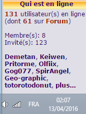 ![]() Devant @Poum45, j'en verserais presque ma larmichette (même si ça ne va pas durer ) !-does- : 35 points Poum45 : 34 points ☆ ☆ ☆ WTHellias : 32 points Olfix : 25 points Nyark_Nyark : 18 points Quokka : 16 points petrou : 12 points TrChSl : 5 points Insert : 5 points