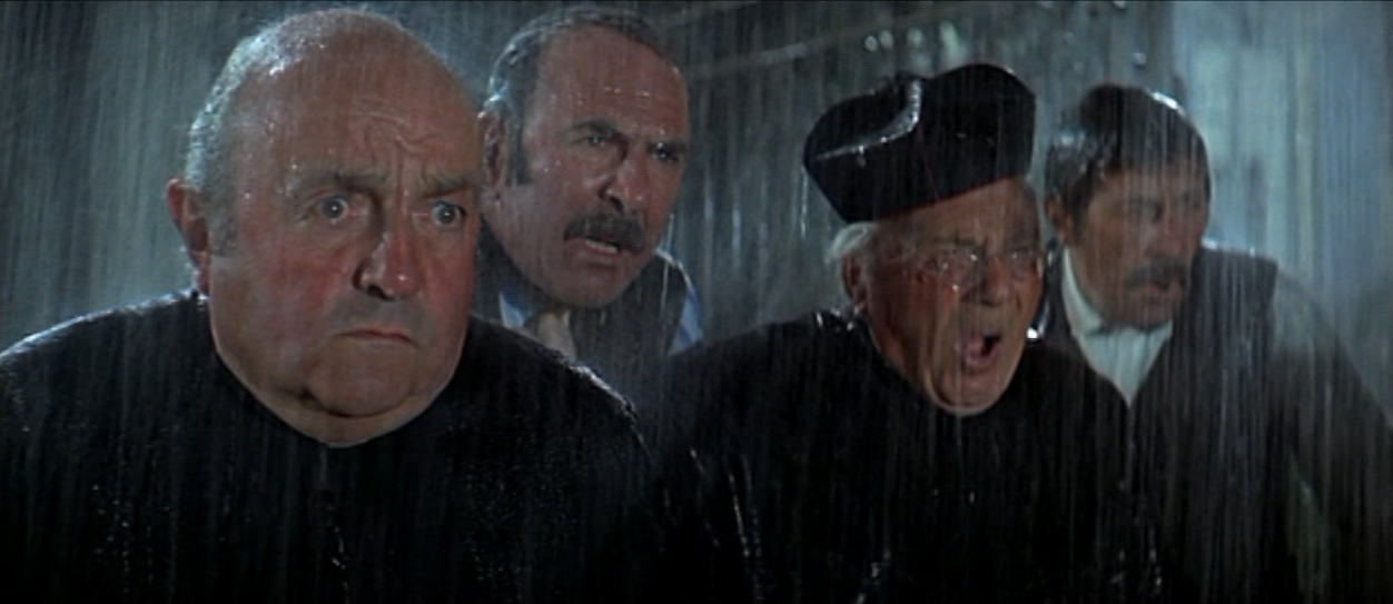 ![]() Rochefort (à droite): Oh non de Dieu, ça mouille autant que de l'eau bénite mais ça n'offre pas le même salut! Marielle (derrière): Je vous avait dit, mes pères, qu'il ne fallait pas la provoquer! Bertin (devant): Jésus-Marie-Joseph! C'est le déluge! Blier (à gauche, en pensée) . ° (C'était donc ça une femme fontaine? Mais pourquoi, diantre, ai-je choisi les "voies" impénétrable du Seigneur) Je me dis qu'il faut absolument que je revois "Calmos"!