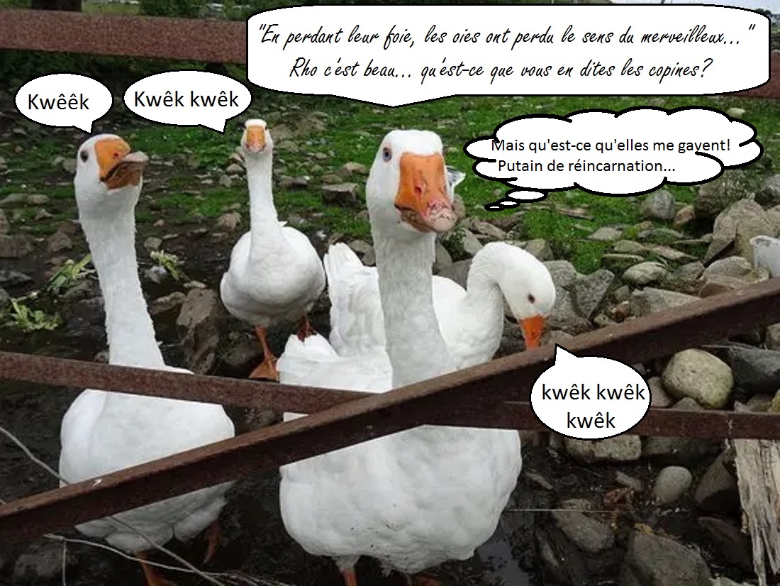 ![]() "Dans ma dernière publication, je présente les résultats d'une recherche menée par mon équipe et réalisée auprès d'un échantillon aléatoire d'oies que nous avons suivies pendant 2 ans dès leur naissance, et ce sur tout le territoire national. Les conclusions sont édifiantes, et nous ne nous attendions pas du tout à des disparités d'une telle ampleur. Très rapidement, nous avons en effet découvert que 98,7% des oies habitant le quart Sud-Ouest présentaient déjà des signes d'obésité morbide, quelques mois seulement après leur naissance. Quelques mois plus tard, généralement un peu avant décembre, les individus âgés de plus d'un an étaient tous décédés dans d'étranges circonstances. Il est urgent de réagir. Par principe de précaution et en attendant les résultats d'une enquête complémentaire en cours, nous demandons de toute urgence aux autorités l'interdiction de mise sur le marché du maïs provenant des régions Nouvelle-Aquitaine et Occitanie, qui présente des risques sanitaires évidents."