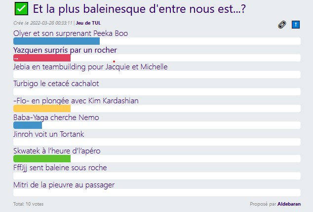 ![]() Bon vote à tous! @Quenelski @DoubleZ @Mitri @Yazguen @Nakedgirl @Aldebaran @KoolKat @Alex333 @Angharad @Asmodeus @FffJjj @Infame_ZOD @Insert @lvishd @Nyark_Nyark @Olfiix @Puuulp @Sheitz @SonyDian @WTHellias @Ataync @Infame_ZOD @ouzvig @vivaberthaga @Jinroh @-Flo- @karapahuu @Baba-Yaga @Jebia @Turbigo @momoaliz @fede27 @Olyer Et la plus baleinesque d'entre nous est...? Crée le 2022-03-28 00:33:11 | Jeu de TUL | proposé par Aldebaran Olyer et son surprenant Peeka Boo Yazguen surpris par un rocher Jebia en teambuilding pour Jacquie et Michelle Turbigo le cetacé cachalot -Flo- en plongée avec Kim Kardashian Baba-Yaga cherche Nemo Jinroh voit un Tortank Skwatek à l’heure d’l’apéro FffJjj sent baleine sous roche Mitri de la pieuvre au passager[Participer au sondage]