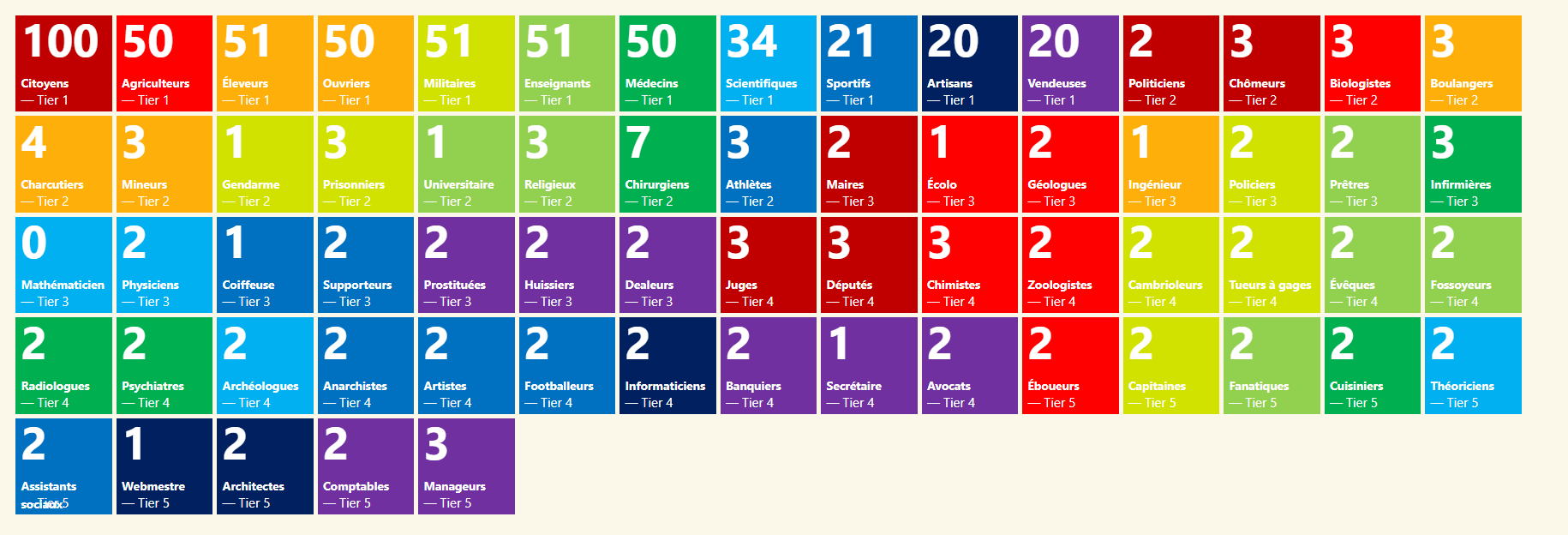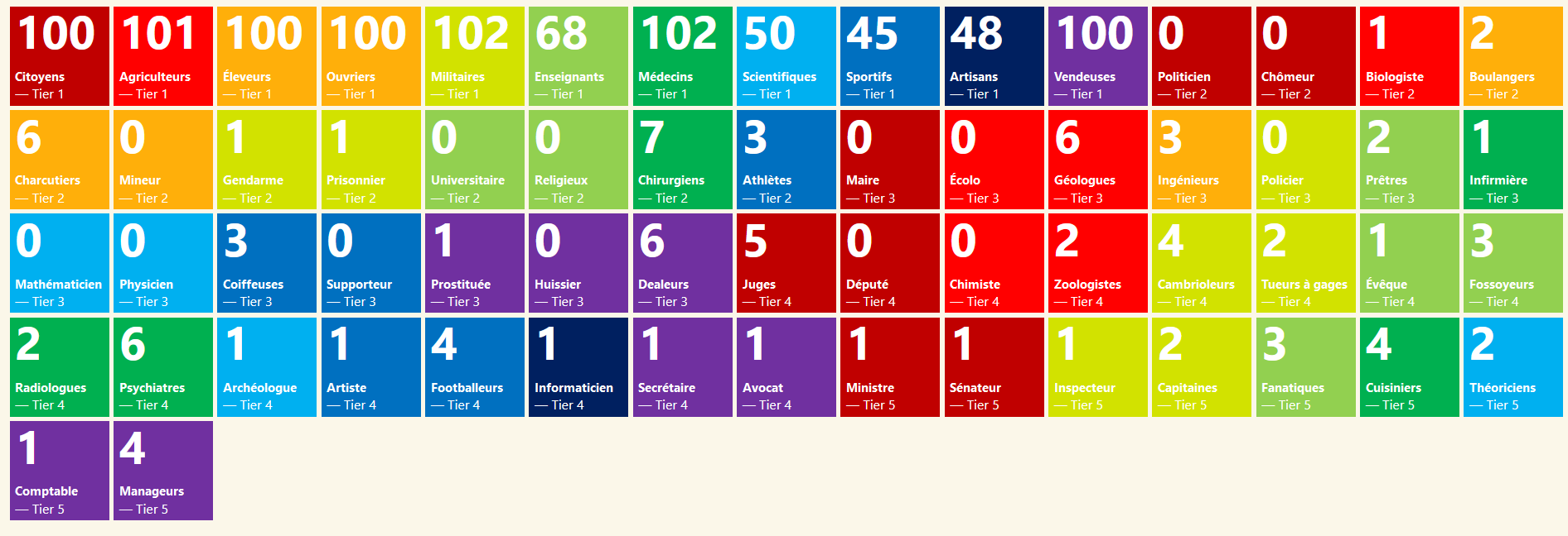 ![]() D'ailleurs, je viens de remarquer un truc. J'ai pas mal de découverte du côté Légal : gendarme, policier, avocat, inspecteur mais j'ai rien du côté Protection/Santé : pompier, ambulancier, sécuritas C'est moi ou alors ça manque ?