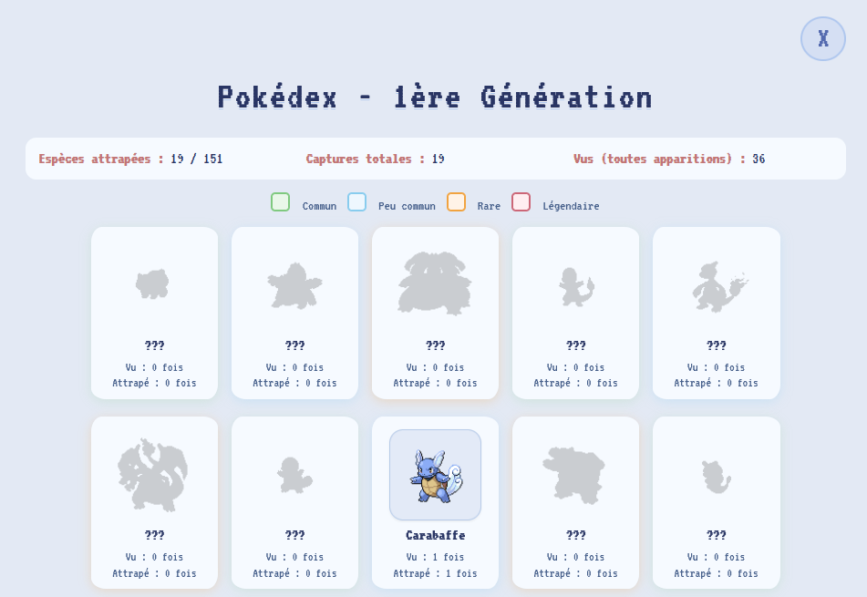 ![]() Carte Dresseur Pokémon Pokédollars : 2480 ₽ Pokémon découverts : 27 / 151 Top captures [1] Carabaffe (×1) [2] Pikachu (×1) [3] Nidoran femelle (×1)
