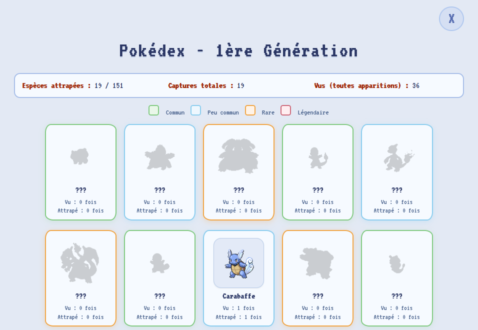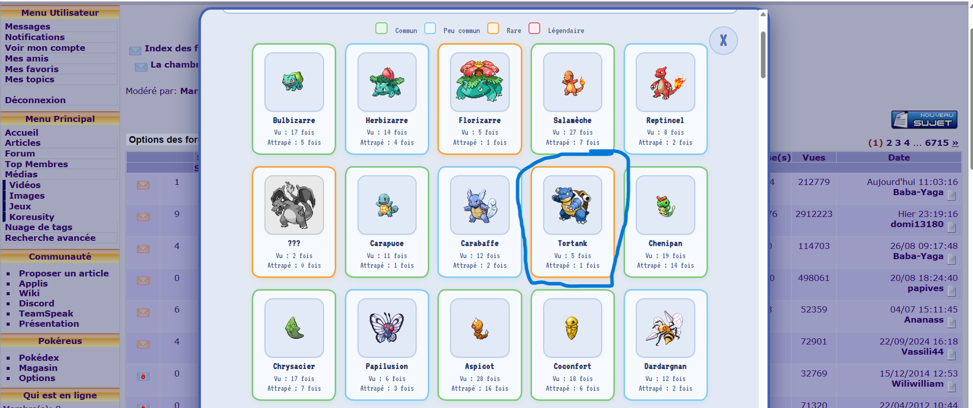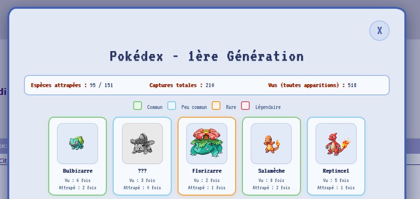 C'est possible d'ajouter des options de tri (par rareté, par nombre de pokémons attrapés, etc.) et des filtres (vu, pas vu, attrapé, etc.) au pokédex ? Et pour la carte dresseur, pouvoir choisir les pokémons à afficher ? Pour l'affichage de @Baba-Yaga, le style Koreus Dark est peut-être en cause. Sans : ![]() Avec : ![]()