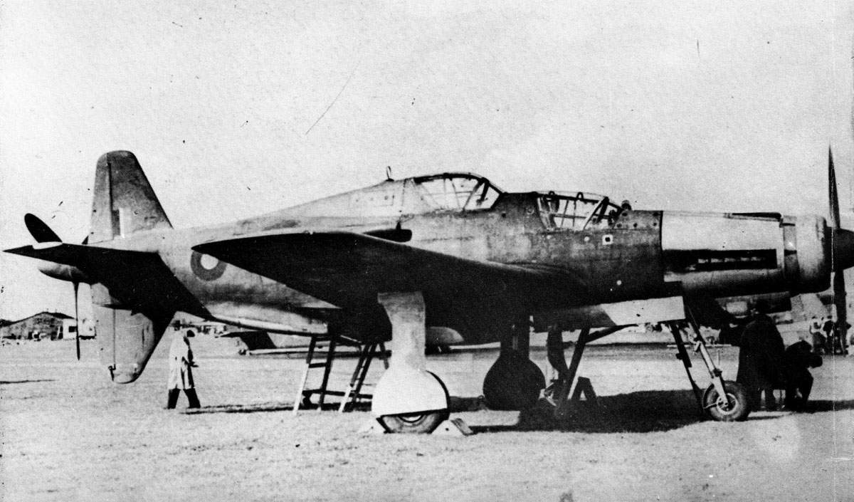 ![]() Il s'agit ici d'un Do-335 d'entraînement, comme le prouve le second poste. Le marquage spécial (en effet, on n'y voit pas la cocarde de la Luftwaffe mais celle de la Royal Air Force), c'est parce que ce sont les Américains qui ont récupéré cet appareil lors d'une mission et qui l'ont donné aux Anglais.