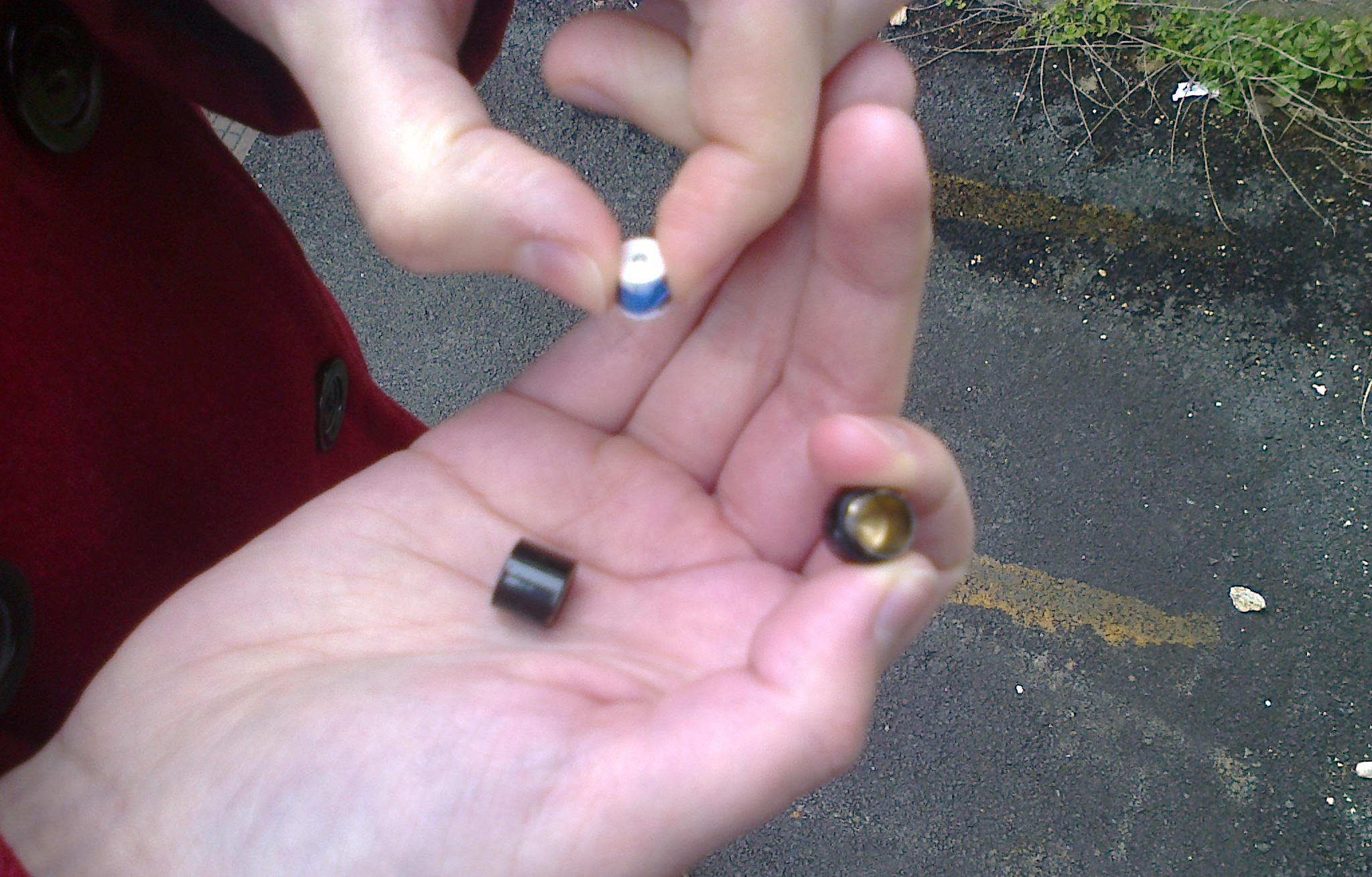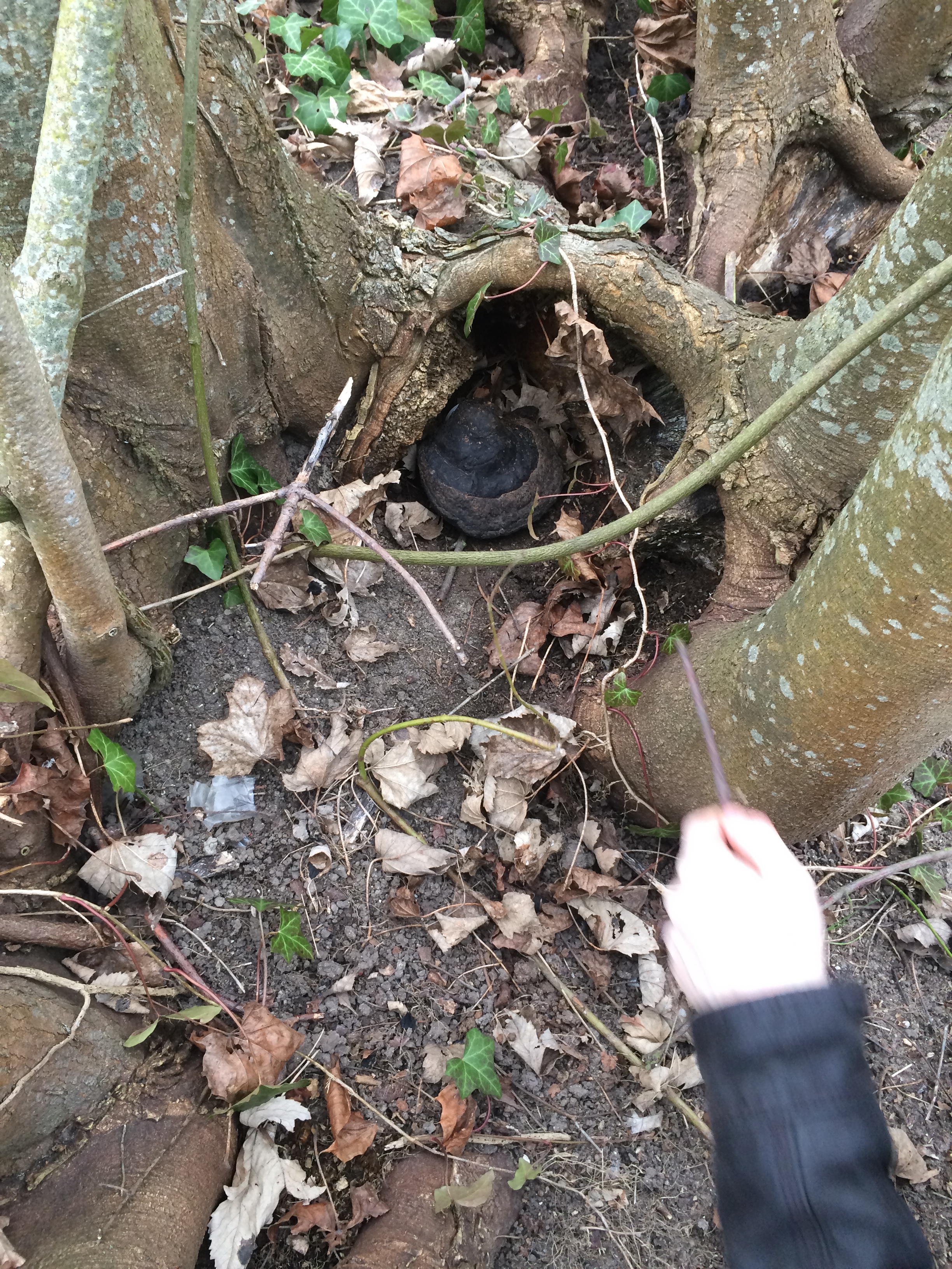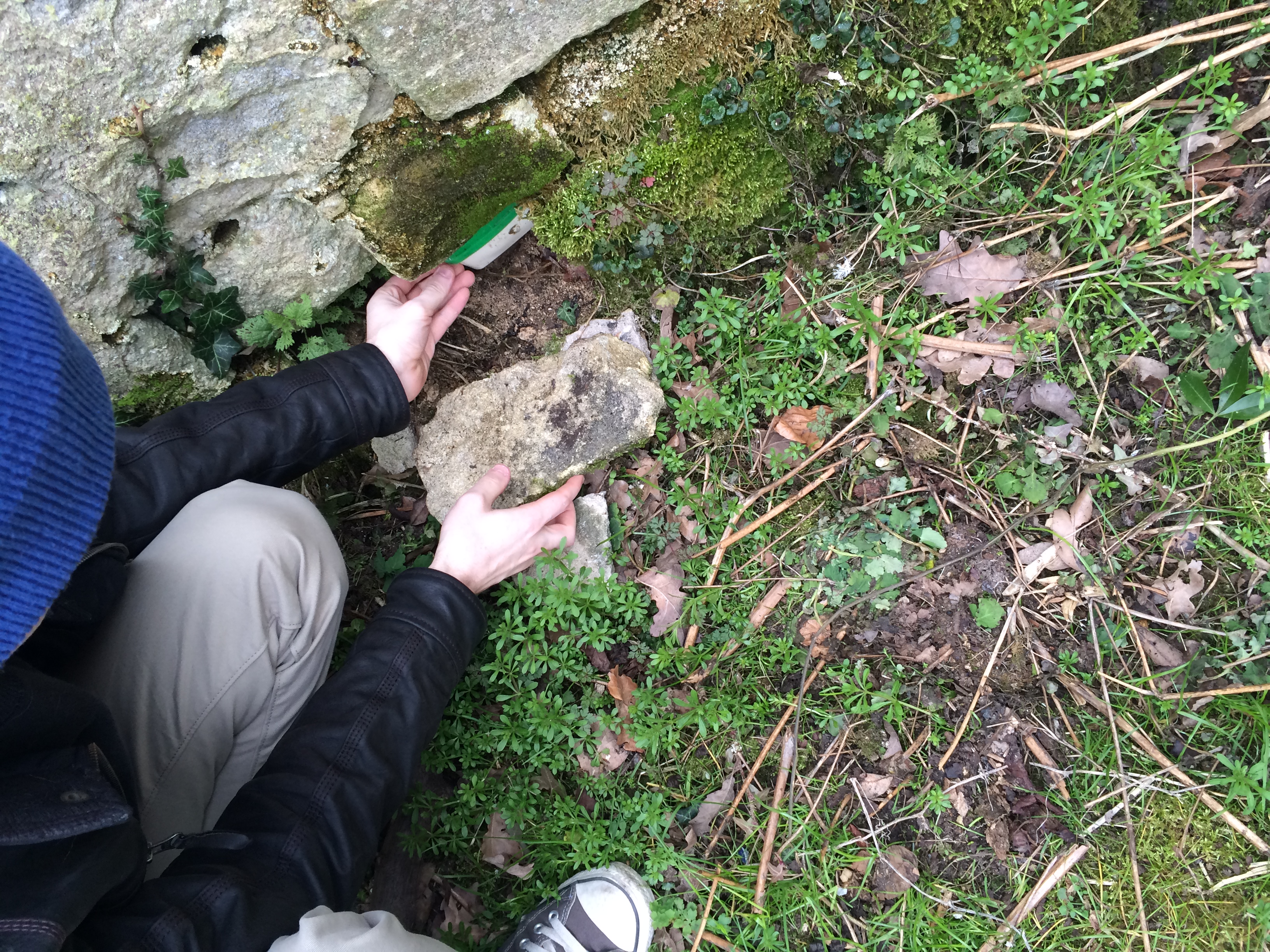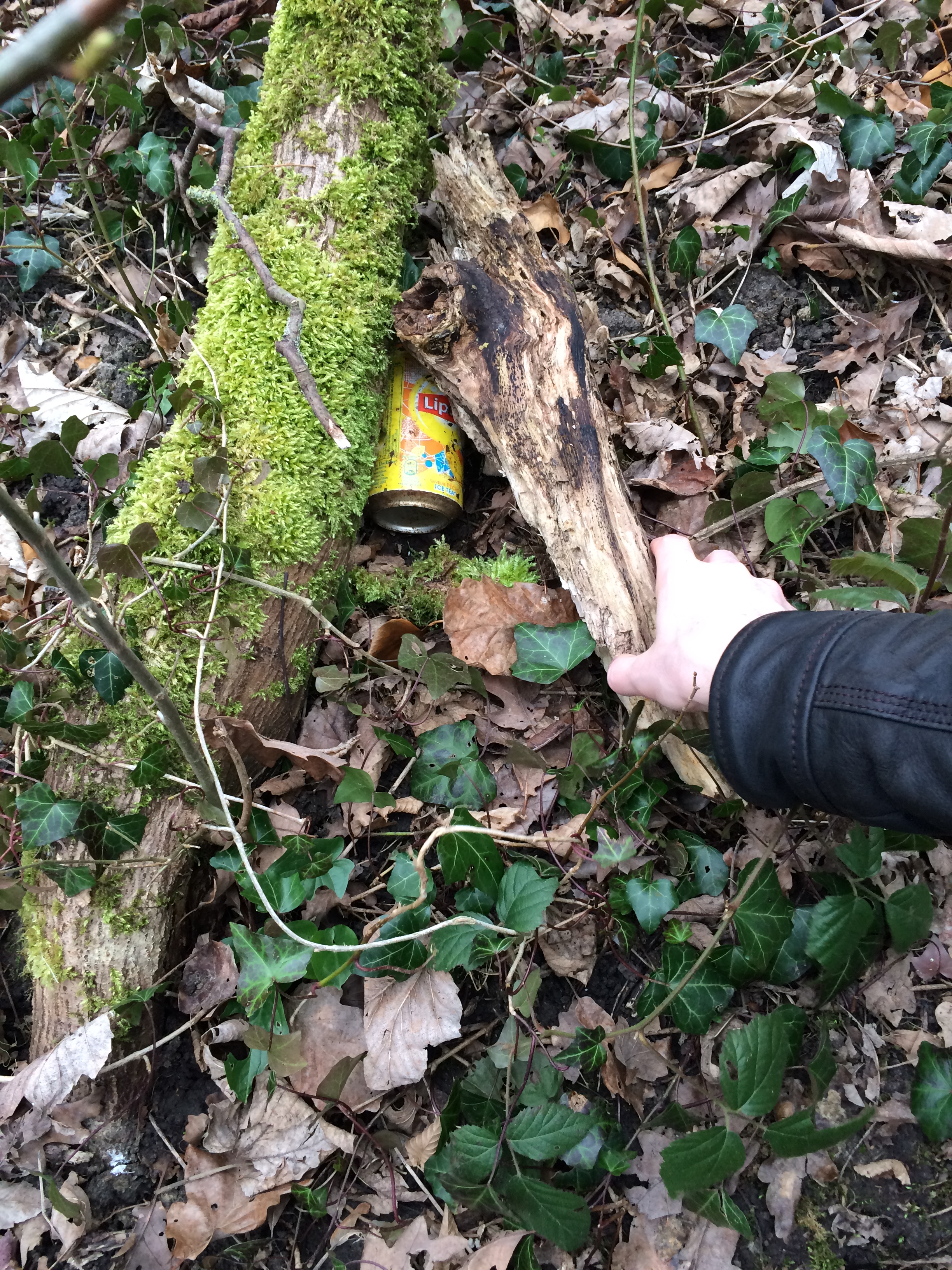 La première était aimantée sous un banc, l'indice c'était "asseyez-vous" ![]() (pas de photos) La seconde, plus vicieuse, en dehors d'un sentier avec indice "champignon de bois" le champignon en question: ![]() le tube planté dedans: ![]() Ensuite c'était une cache mystère (avec une énigme qui nous amène à plus de 2 KM de l'étape de départ :roll:) dans un endroit assez fréquenté avec pleins de moldus autour donc y a fallu aller la chercher en s'cret rapidement! Planqué derrière une pierre d'un mur dans des mini douves: ![]() Avec des petits objets dedans: ![]() La dernière, la plus dure, en pleins milieux des bois, avec comme indice: "jeté par dessus les buissons" mais pas de buissons, juste une forêt morte d'hiver ![]() Planqué sous une branche: ![]() et dans une fausse canette déchet. Très dur à trouver car au milieu d'autres déchets, et oui, malheureusement les gens sont des porcs! ![]()