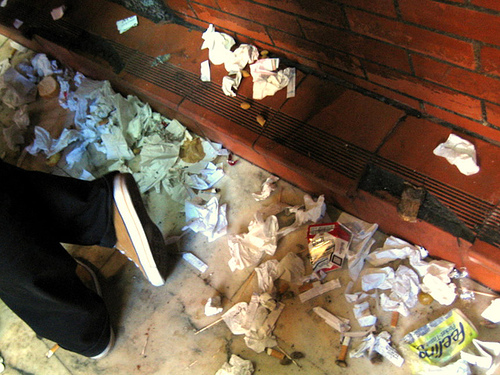 La Canebière à Marseille, tous les jours sur tout le long de l'avenue (1km). Et bon nombres de quartier à Marseille sont dégueu comme ça, les gens jettent leur merde par terre alors que c'est pas des poubelles qui manquent. Le pire c'est qu'il existe une police exprès pour ça...