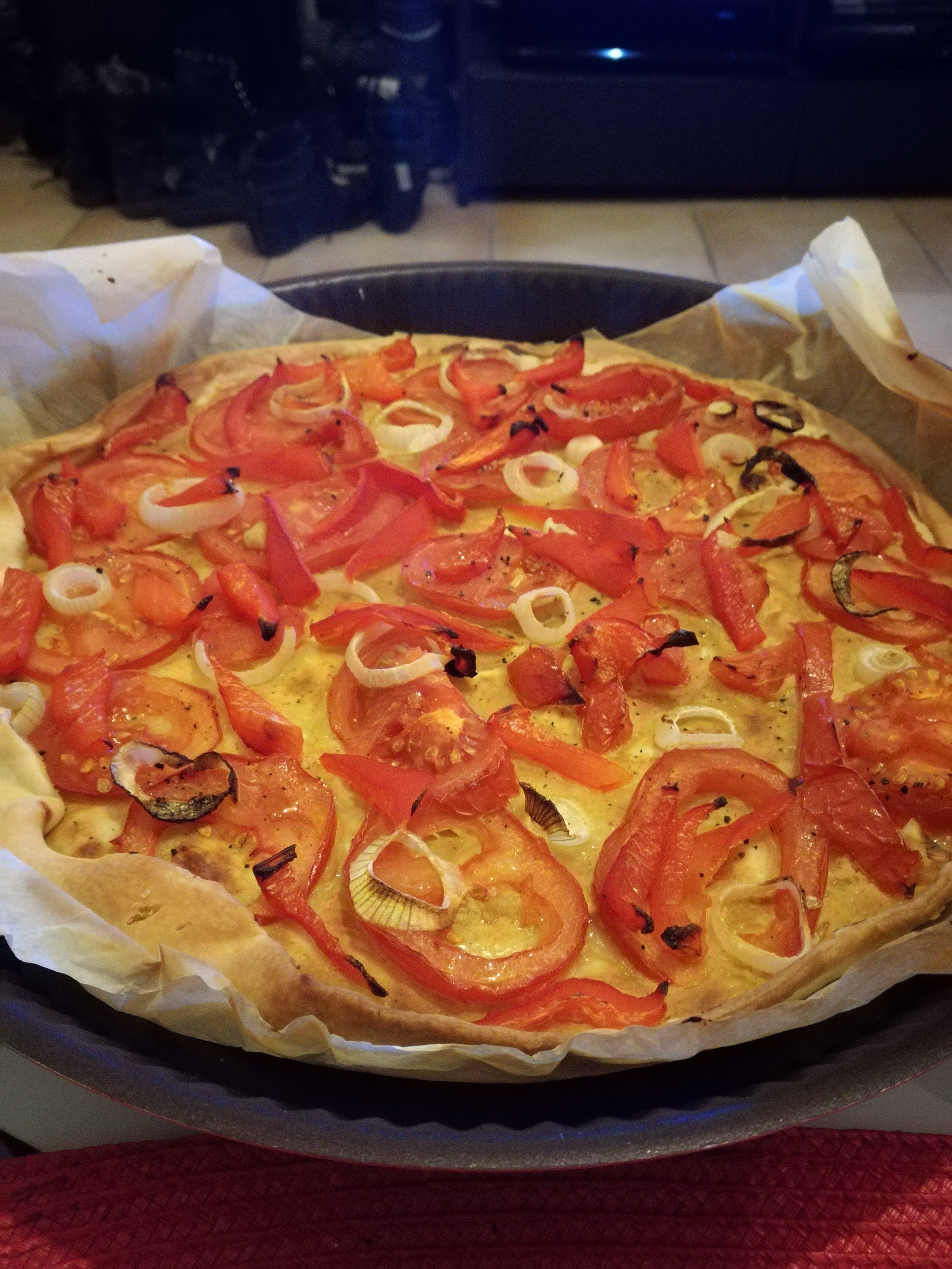 une tarte , tu mets de la moutarde dans le fond (comme de la tomate dans une pizza) , tu rajoute des tranches de tomates , du poivrons préalablement cuit dans le four et pelés , des oignons pis un peu de sel , de poivres et de l'huile d'olive . tu peux mettre un peu de gruyère rapé si tu aimes ca . vouala !!! c'est tout bête mais bon quand tu as la flemme de faire un truc trop chiant à manger \o/