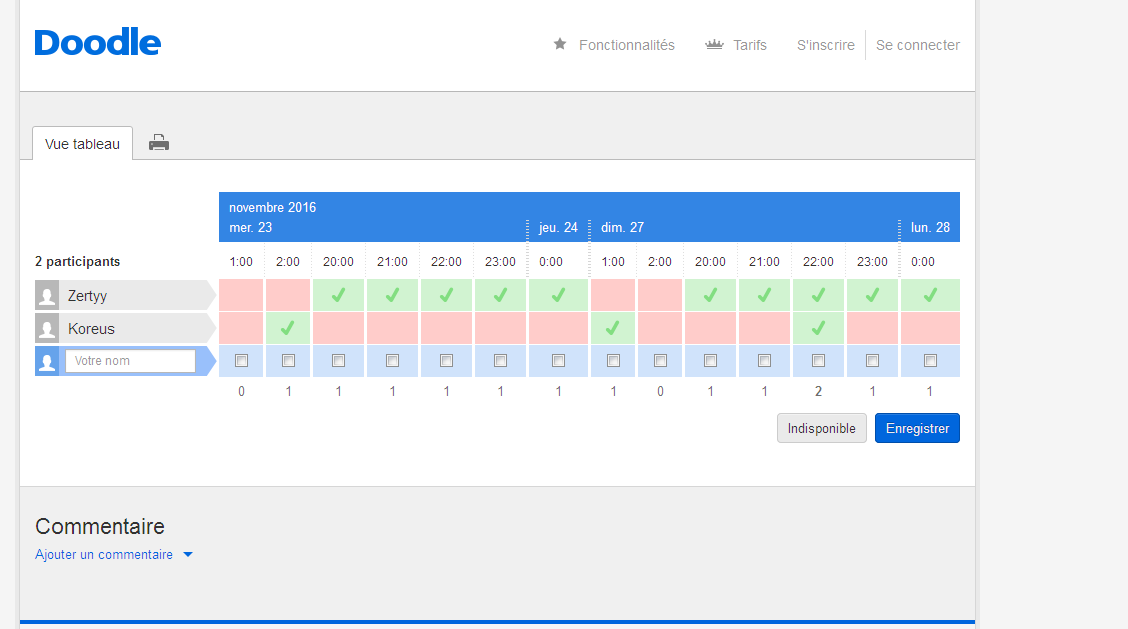 Résultat des votes : http://doodle.com/poll/3ptbtmmwqgy97rks Comme je l'ai expliqué sur le jeu, on va prendre à la majorité. Tout en prenant compte Yoshi, SuperPM et cobi pour la gdc du Mercredi/jeudi, ils n'ont pas choisi le même horaire, donc on va se rapprocher le plus possible et ce sera : MERCREDI à 00h00. Tout en prenant compte Zebbra et taxidermiste pour la gdc du Dimanche/lundi, ils n'ont pas choisi le même horaire, donc on va se rapprocher le plus possible et ce sera : DIMANCHE à 23h00. Récap : Lancement le dimanche à 23h00. Lancement le mercredi à 00h00. Zebbra, taxi, superPM, yoshi, cobi, est ce que cela pourrait quand même vous convenir ? (a savoir qu'il y a juste un décalage d'1 heure pour vous)