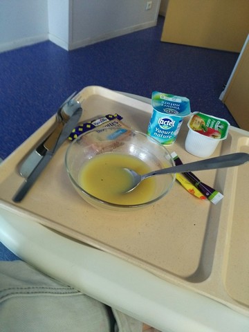 M'en parle pas, je me suis tapper le même régal pendant plus d'une semaine. Les derniers jours, ma faim passait rien qu'en voyant le plateau arriver. :-?
