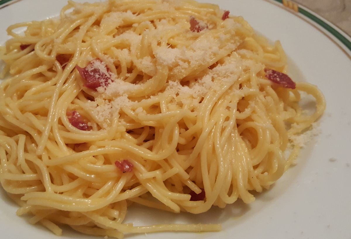 De véritables Pasta alla Carbonara (sans crème ni lardon mais des jaunes d’œufs, beurre, pancetta et parmesan) :coeur:
