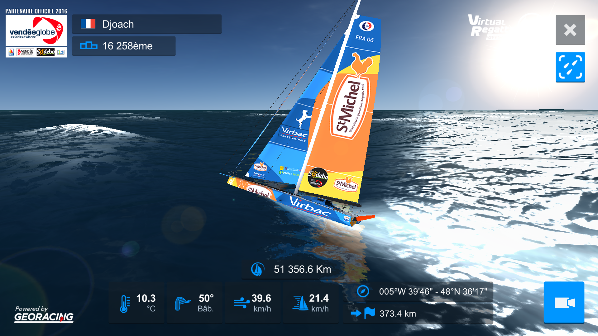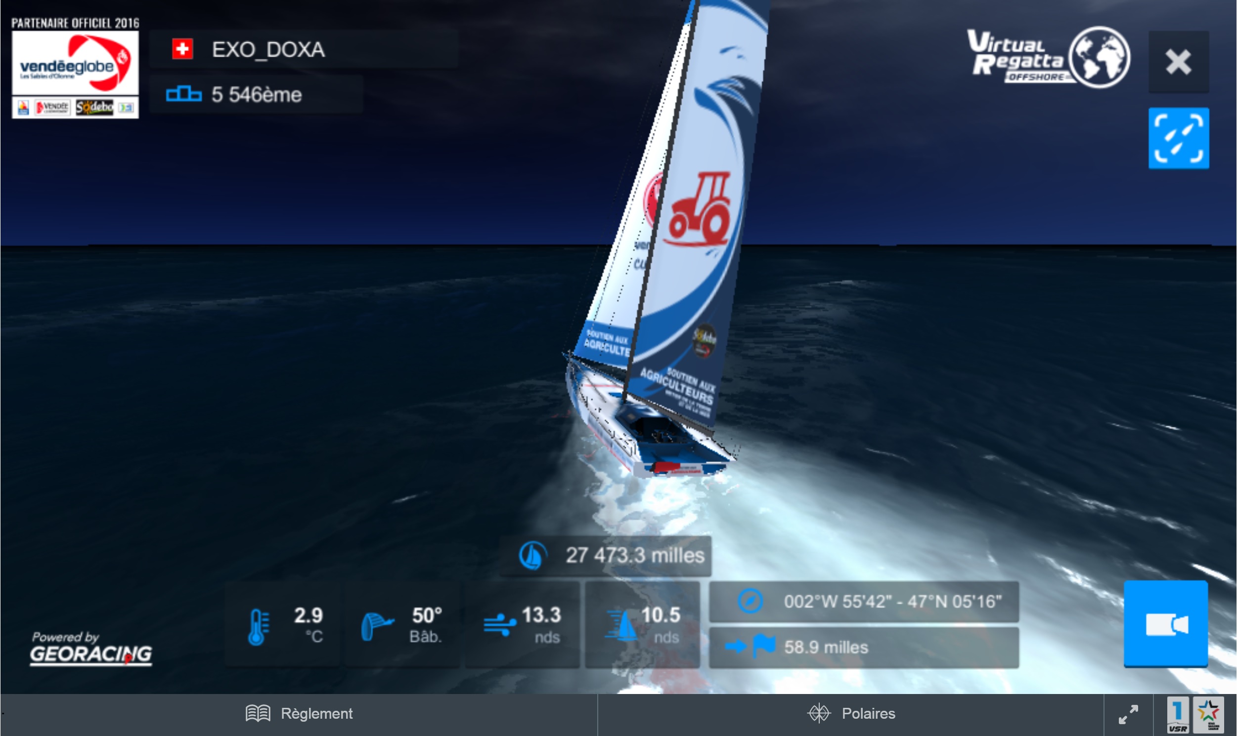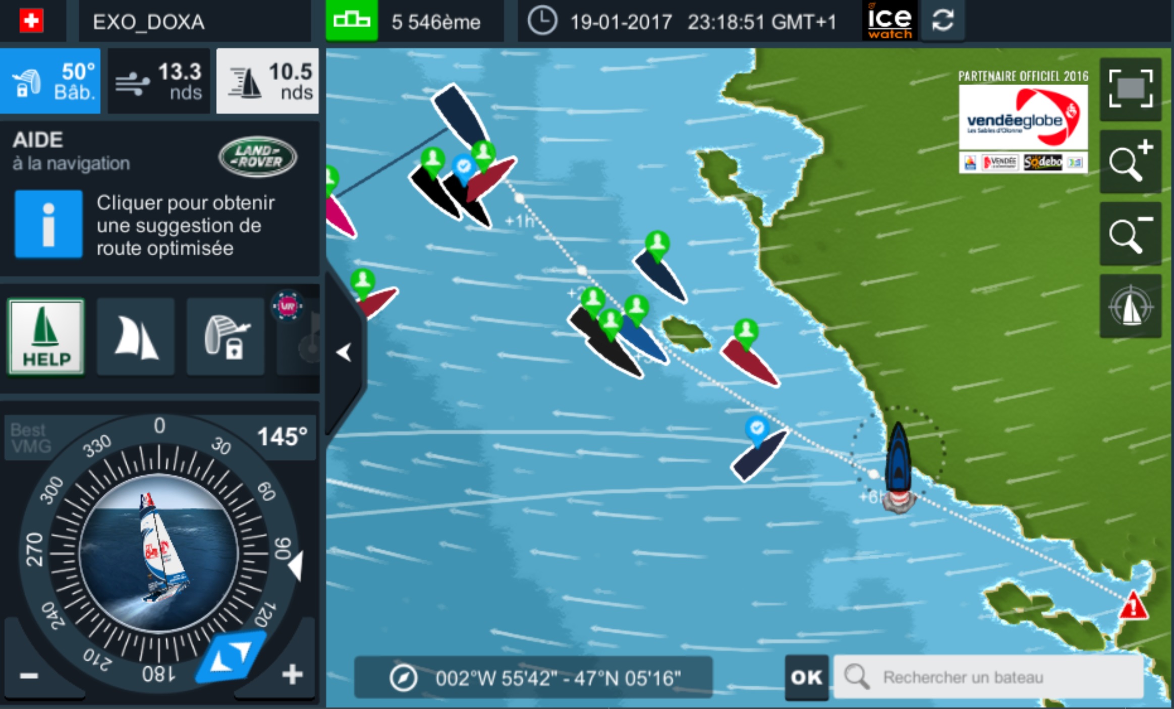 Pour ce qui est de VR, je devrais arriver demain matin aux Sables d'Olonne. Je vais devoir faire un virement de bord dans ~2h et espérer ne pas me prendre la côte avec le régulateur d'allure activé avant l'arrivée.