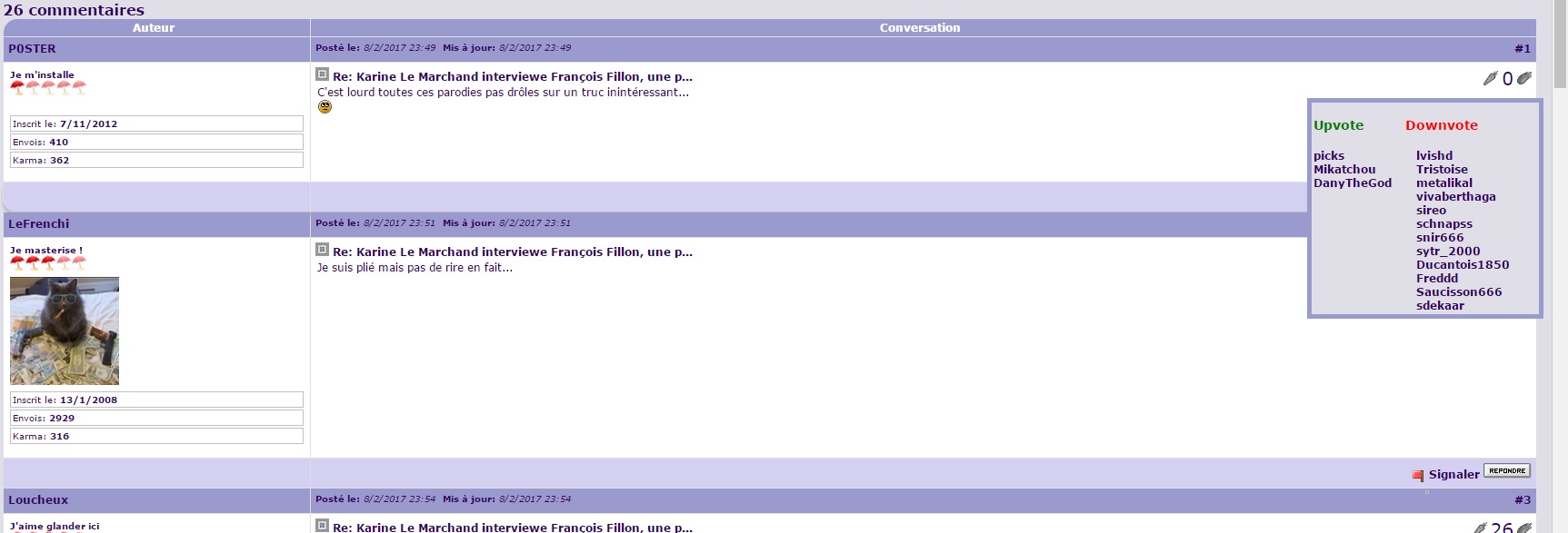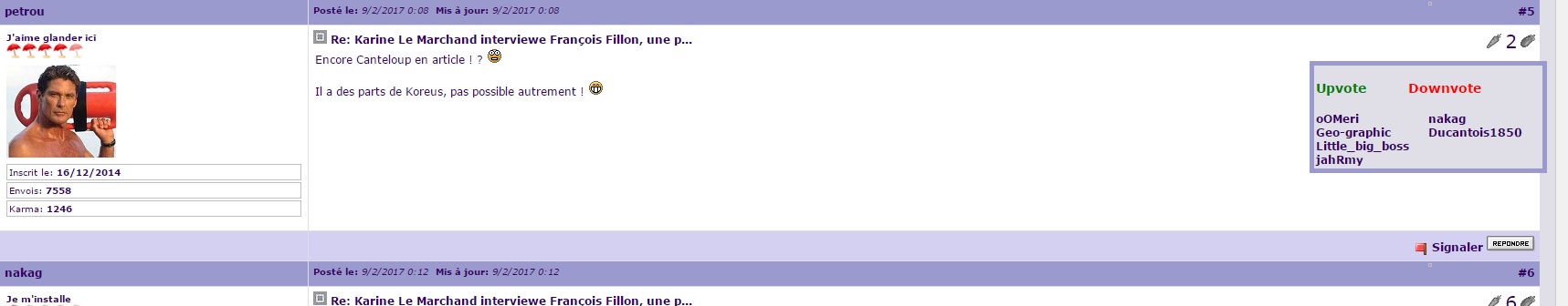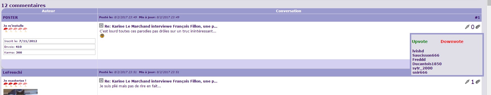 Dans le dernier article (Karine lemarchand et Fillon), y a un membre qui a 0 en Karma affiché, alors qu'il a que des upvotes affichés. Y a eu un changement pour ne plus afficher les membres qui downvotent c'est pour ca ? Pourtant y a pas ce pbl pour un commentaire d'en dessous. Je peux comprendre qu'il faille qq minutes pour mettre a jour les membres affichés qui up/down votent, mais la environ 6h ont passées. Bug sur uniquement le 1er commentaire d'un article ? (aucun bug sur les commentaires suivants) ![]() ![]()