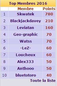 ![]() Faut-il mettre a jour l'intitulé "Top membres 2016" ? (Le mec qui se la joue controleur des travaux finis) ![]()