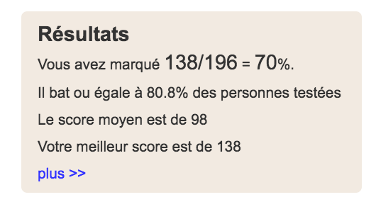 Le plus frustrant est surtout de voir ensuite la quantité de pays que j'ai oublié mais que je connais (mais que je ne serais pas foutu de placer avec précision sur une carte, soyons honnêtes). Un bon test qui mesure l'étendue de mon inculture géographique, mais vu que j'en étais conscient, ça passe ![]()