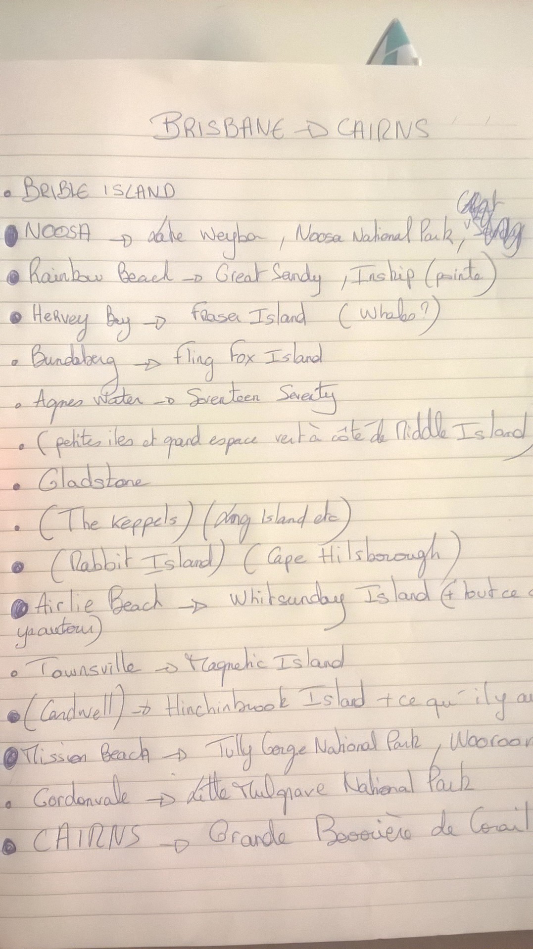 J-4 debut du roadtrip sur la gold coast jusqu a Byron bay. Ensuite, go la Sunshine Coast ! Mon compagnon de route vient de passer a l appart, on s est fait un topo de ce qu on voulait faire a priori (histoire d avoir une ligne directrice et de savoir ce qui se fait) de Brisbane a Cairns, et ca donne ca : ![]() Ca va etre coooooool ! (oui, cette laide ecriture est la mienne:-o )