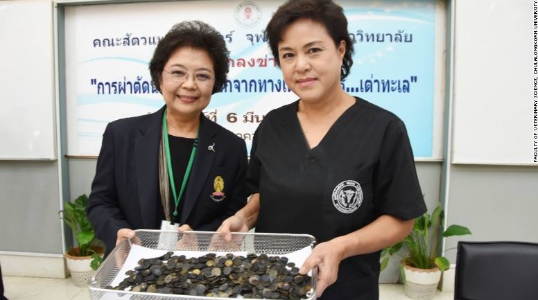 "L'opération était devenue indispensable pour sa survie. Omsin ("Tirelire" en français), une tortue femelle de 25 ans, a été opérée par les vétérinaires de la faculté des Sciences de l'université de Chulalongkorn de Bangkok (Thaïlande), lundi 6 mars, pour extraire 915 pièces de monnaie. Des pièces de monnaies jetées par les visiteurs du zoo de Si Racha pour porter chance, précise Reuters (en anglais)." (via francetvinfo.fr)