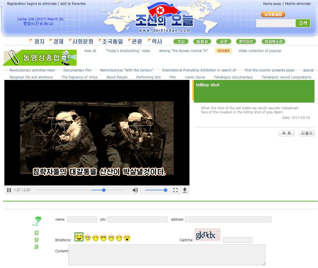 ![]() (Ca démarre à 4:50) Guys Prank Friends with Grenade Via reddit.com - - - - - Une vidéo Nord-Coréenne qui semble etre pour faire la publicité d'un centre de tire de loisir, promeut son activité en mettant en scènes des militaires américains comme cibles. Cette vidéo a été vue (et l'est toujours d'ailleurs) sur le site dprktoday.com, un site internet d'actualité basé en Chine et financé par la Corée du Nord. North Korean propaganda video Via reddit.com ![]()
