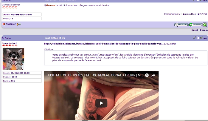 Citation : Vous pensiez avoir tout vu, erreur. Avec “Just tattoo of us”, les Anglais viennent d’inventer l’émission de tatouage la plus grotesque qui soit. Le concept : des volontaires acceptent de se faire tatouer un dessin créé par un ami sans le voir et le valider. Le plus sûr moyen de perdre la face et un ami. JUST TATTOO OF US 102 | TATTOO REVEAL: DONALD TRUMP | MTV UK http://www.mtv.co.uk/just-tattoo-of-us