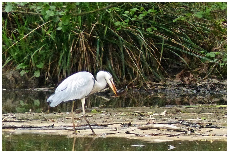 Deux Foulques (oiseaux d'eau) s'affairent près de leur nid qu'elles voudraient bien consolider ou sur lequel elles voudraient peut-être monter. Un Héron les en empêche en les agressant, mais l'une d'elle réagit assez violemment. Le Héron s'en va penaud. (pas de sang heureusement, moi je n'aime pas la violence)
