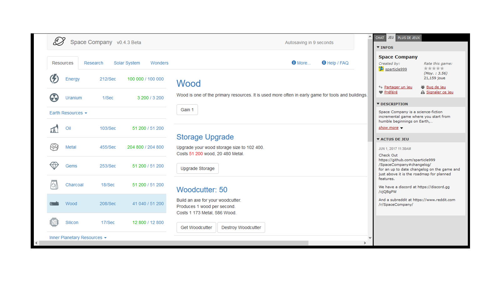 | Je viens d'arriver    Inscrit: 29/04/2016 22:37 Post(s): 61 |  Space Company   >>> Jouer à Space Company <<< Synopsis: Tu coupes du bois, pour finir loin, très loin dans la galaxie. Comment Jouer: • souris Genre: #idle #upgrade Bon jeu!