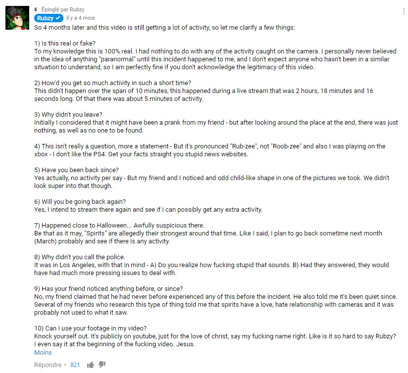 Ghost/Haunting Caught Live on My Stream - (All events) Rubzy fait un streaming depuis l'appartement d'un ami à l'occasion d'un pet-sitting. D'étranges phénomènes paranormaux vont s’enchaîner durant les 2h de streaming (porte qui claque, lumière qui s'allume, objets qui bougent et qui tombent). Comment peut-on rester dans un appartement de la sorte avec tous ces événements ? FAKE OU PAS FAKE ? Forcement, d'après l'auteur tout semble être véridique. Mais la vignette pue tellement le fake... ![]() I WANT TO BELIEVE. Il a fait une deuxième session dans cet appartement pour voir si les phénomènes seraient de retour. Superbe idée de jouer à Outlast 2 dans ces conditions n'est-ce pas ? Haunted Live on Stream - All Haunting/Events - VIOLENT Entity - Full Stream Link in Description Je crois qu'il n'est pas le bienvenue dans cet appart. Ma réaction aurait été: https://youtu.be/9wO5TnYaJ4o?t=53s