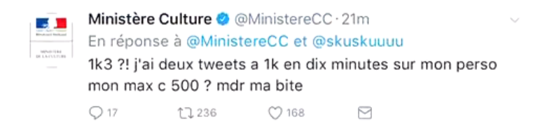 ![]() ![]() Le compte Twitter du ministère de la Culture @MinistereCC en roue libre ce soir https://t.co/ivs2NMmWxv Plus d'infos