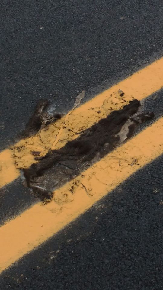 ![]() Au Québec, la ligne de peinture jaune d'une route passe sur un animal qui a été victime de la route...