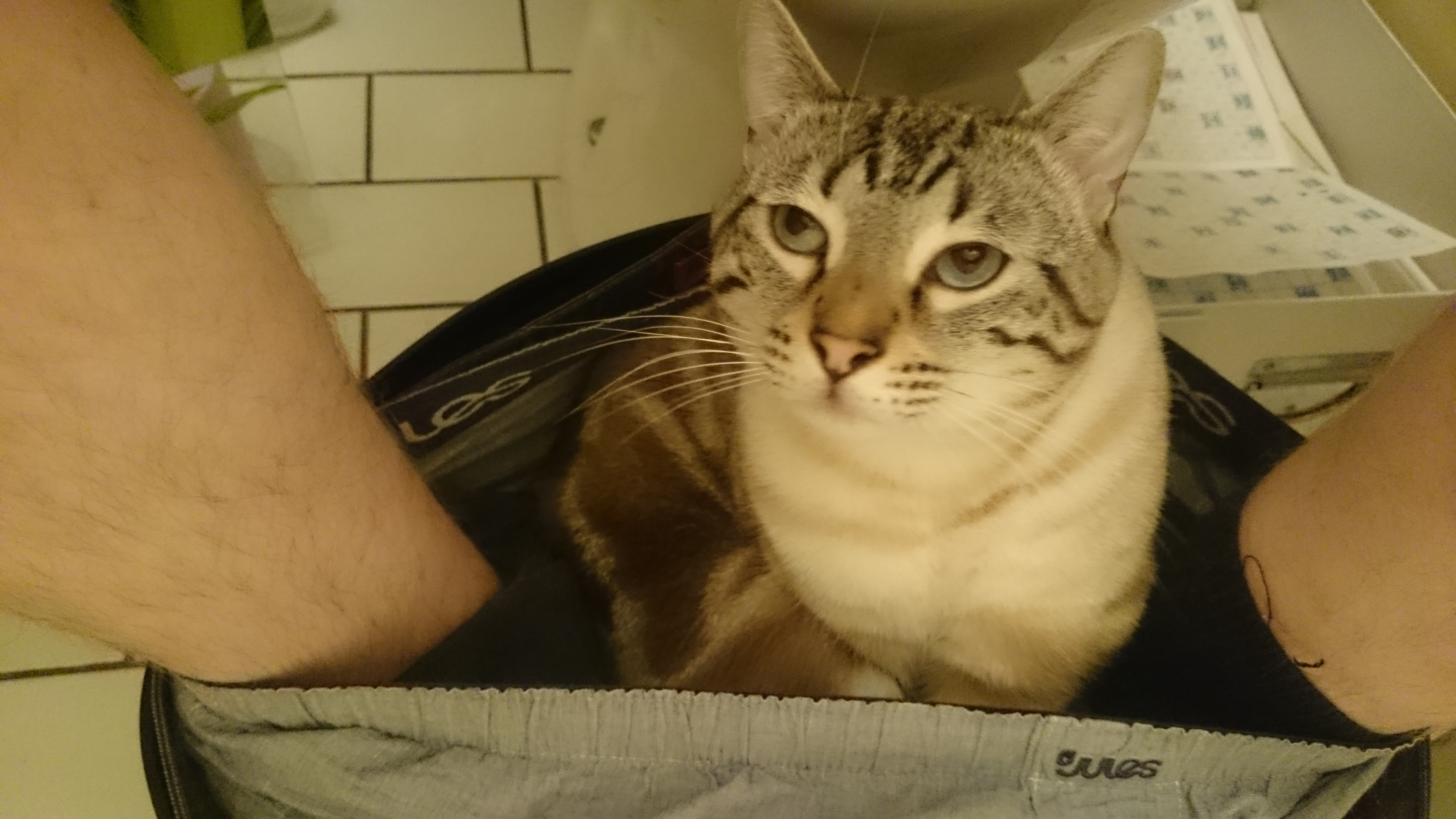 Un chat qui aime venir se mettre dans le calecon d'une personne pendant qu'il est aux toilettes