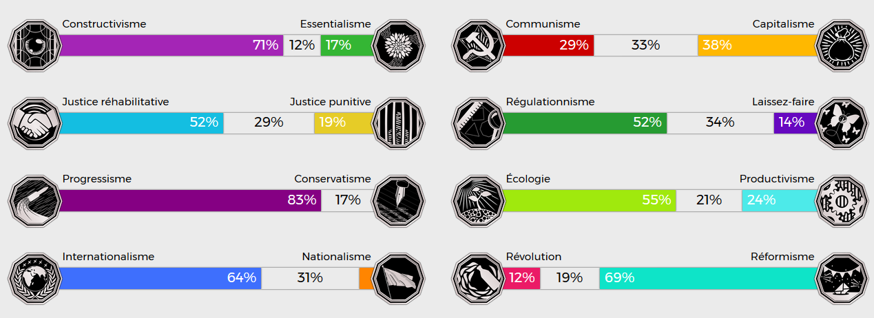 Le test est sympa mais le résultat peu crédible à partir du moment où la réponse "Oui" à la question "Biologiquement, l'humanité est hétérosexuelle ? " te met dans la case conservateur.