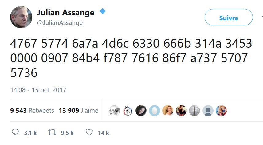 ![]() 4767 5774 6a7a 4d6c 6330 666b 314a 3453 0000 0907 84b4 f787 7616 86f7 a737 5707 5736 Le premier qui trouve à le droit à une sucette! Certains parlent d'un code transmis lors d'un Dead Man Switch (veille automatique/déconnexion après absence d'activité), d'autres parlent de clé pour accéder à un gros dossier sur Hillary Clinton...