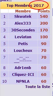 j'ai remarqué 2 petites "erreurs" dans le site 1) dans le menu vertical la liste des top membres a pour titre "Top membres 2017" or l'année 2017 est l'année qui vient de s’écouler... (je parie que tu le savais déjà )![]() Salut @Wiliwilliam 2) dans l'appli le titre "Koreus" en haut de page a encore sa neige et son bonnet de noël, ![]() or les fêtes sont passées... Tu dois te faire une raison et tourner la page ![]() Bonne journée Bisous