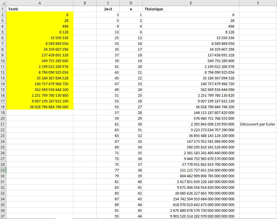 - p est un nombre premier, - 2^p -1 est un nombre premier. Si tu reprends la formule d'Euclide, que tu poses p=x+1 et que tu développes, tu devrais retomber sur ta formule perso ![]()