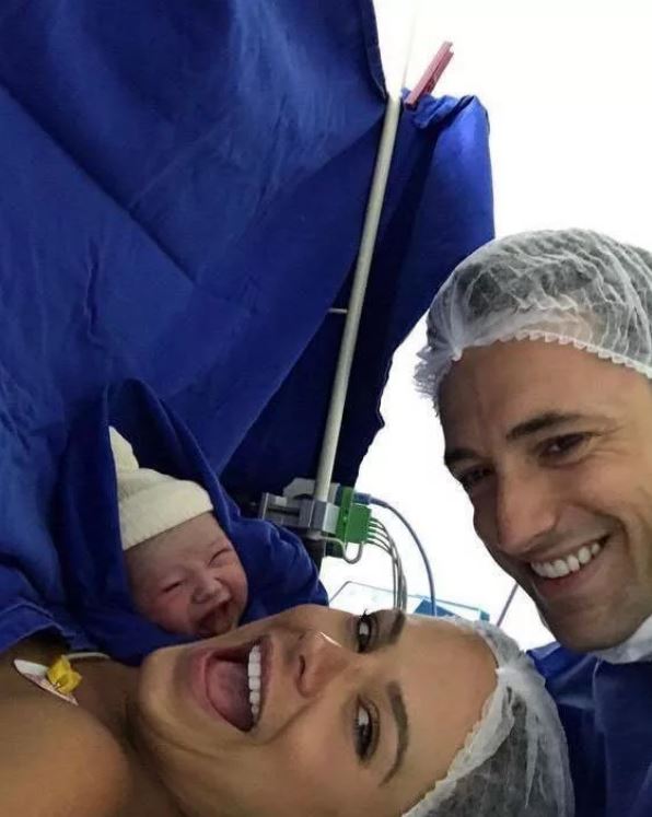 De beaux américains aux belles dents (blanchies certainement artificiellement) avec leur nouveau né tout sourir