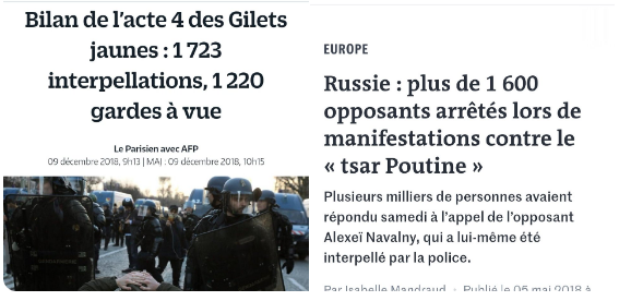 | FantômeInvité | @Iwalan  Tout à fait : http://www.leparisien.fr/faits-divers/un-gilet-jaune-place-en-garde-a-vue-temoigne-c-est-digne-de-la-coree-du-nord-09-12-2018-7964280.php Citation : Un traitement qui a particulièrement agacé leur avocat, Me Avi Bitton. Il y a vrai problème. D'autant plus quand ce sont des jeunes ou des lyceens qui se prennent des flashballs en pleine tête, quitte à s'en faire écraser l'oeil et le perdre. https://twitter.com/ManonMoulin10/status/1071549453801275392 Par contre, le monarque entend la colère des gueux, au delà de pratiquer l'intimidation. http://www.lefigaro.fr/flash-actu/2018/12/09/97001-20181209FILWWW00038-macron-quand-il-y-a-de-la-haine-c-est-qu-il-y-a-aussi-une-demande-d-amour.php "Le vrai problème, c'est quand les gens sont indifférents. Quand il y a de la haine, c'est qu'il y a aussi une demande d'amour" Méthodes fascistes pour protéger les biens de l'oligarchie et personnification arrogante & ultime du pouvoir. Encore heureux qu'ils se présentent comme des "progressistes".  La réalité du pourquoi des gilets jaunes : évolution des impôts depuis 10 ans : Basculement massif de la fiscalité des entreprises vers les ménages. Le peuple paye pour entretenir l'oligarchie, sans aucun résultat sur les chiffres d'emploi et de chômage.